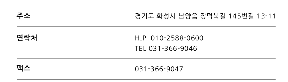 주소 : 경기도 화성시 남양읍 장덕북길 145번길 13-11 대표전화 : 010-2588-0600 / 031-366-9046 팩스 :031-366-9047